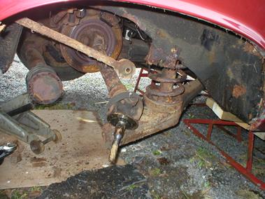 Now this situation calls for a big trolley jack and very careful positioning because you don’t want to clambering around underneath the car if it isn’t safely raised in the air, so we make sure we get the car well up in the air and put our sturdy ramps under neath the suspension cross member with a good sized block of solid wood in between. This way there is no way the car is going to descend until you want it too, also once supported on the ramps, the jack is now available to use later. Once we had the car in the air, we struggled to start with getting the wheel off. This was because unlike previous replacements we had done, this one had snapped and the elbow had rolled forward onto the bottom link arm. Previous ones we have done were after the elbow had rolled backward. Anyway what you see to the right is the failed point with everything roughly back in position after the wheel was removed. To the left are the old and new elbows for comparison, a fair bit now missing on the old one. Once all the car is supported properly and securely, it is a fairly simple process of un bolting the top and bottom link arm bolts and the bolts around the De-